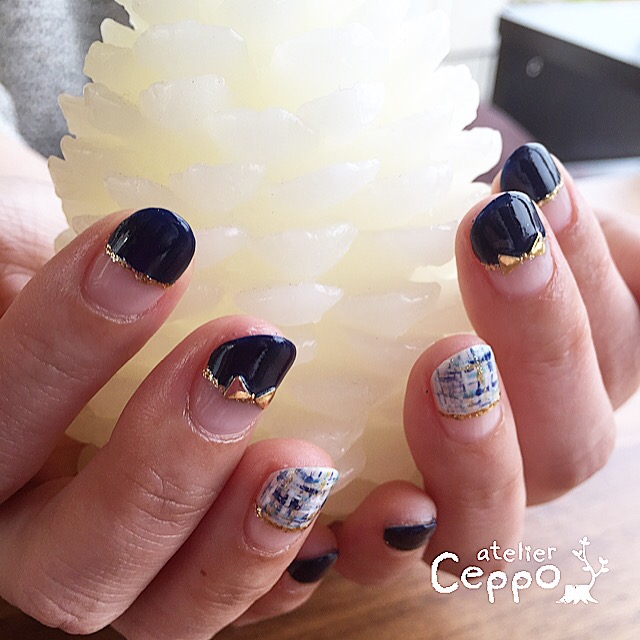 お客様ネイル by nms0121 on 2016年1月6日 in 未分類 • 0 Comments あけましておめでとうございます‼️ アトリエceppoのミキです。 もうお正月気分もすっかり無いですが、今日からお店の仕事初めです。 今年も技術力向上を目指して頑張ります‼︎ よろしくお願いします。 さて、今年最初のお客様ネイルです。 参考価格¥7500 施術時間 約2時間 ネイビーをベースにツイードネイルにしました。やっぱりネイルをすると気分が上がりますね。 喜んでもらえてよかったです。 ありがとうございました。