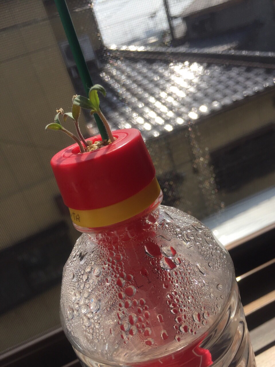 2週間前に植えたペットボトルトマト。