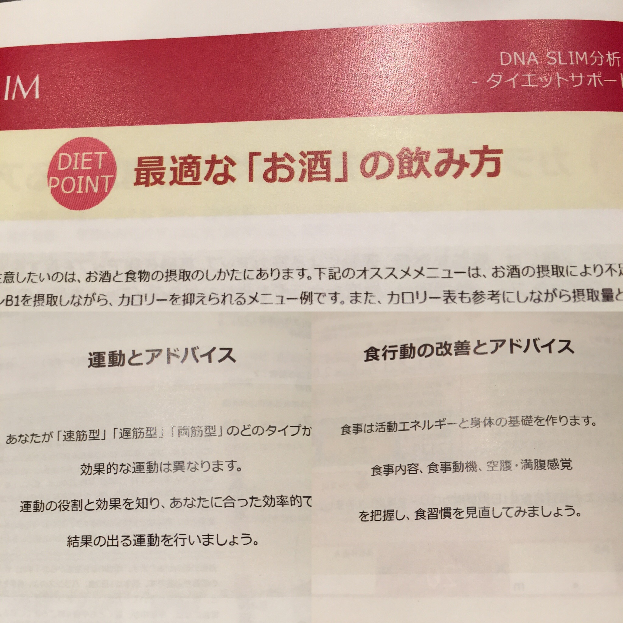 ここまでで自分の生まれ持った遺伝子を知る事ができ、次のページからは食行動の改善、運動のアドバイスが割と細かく書かれてました。
