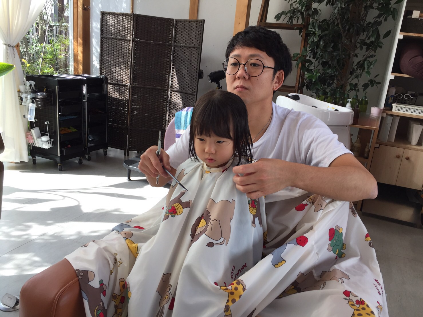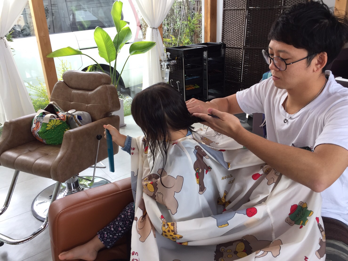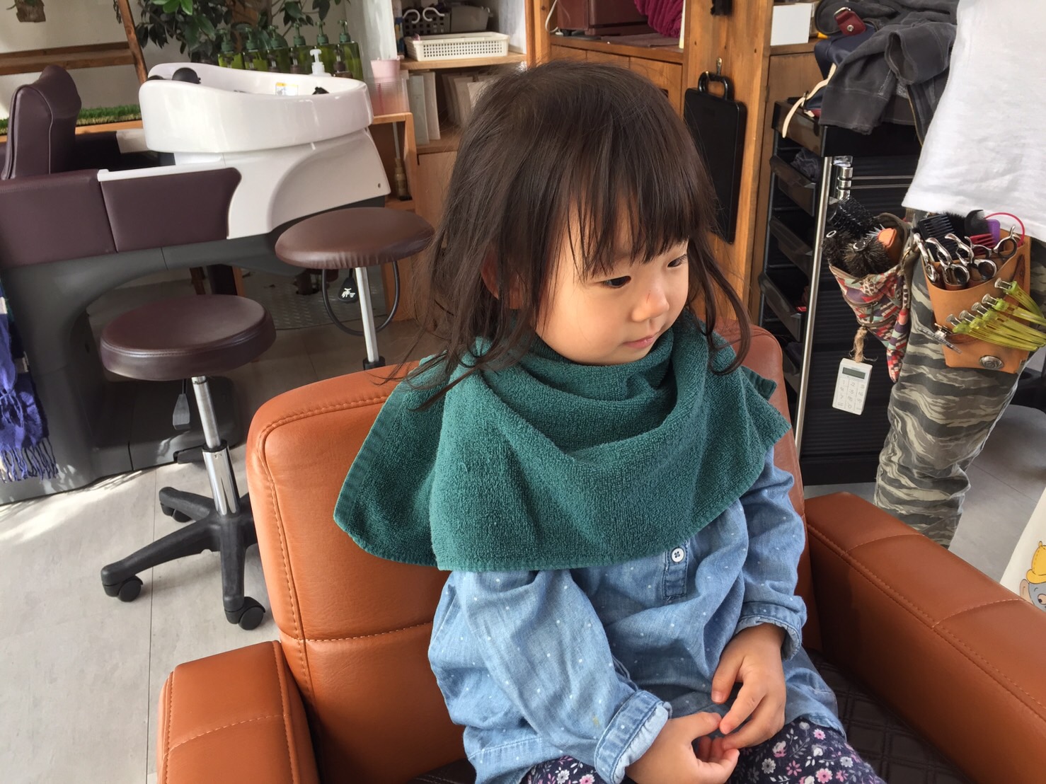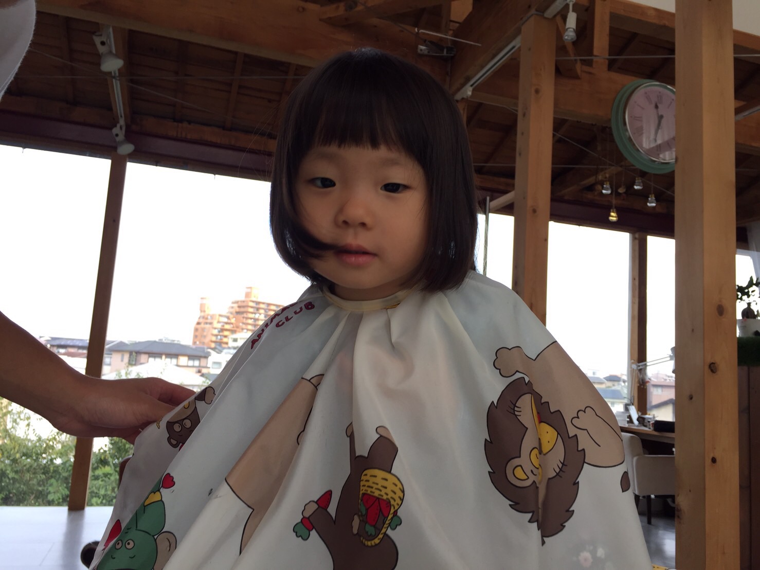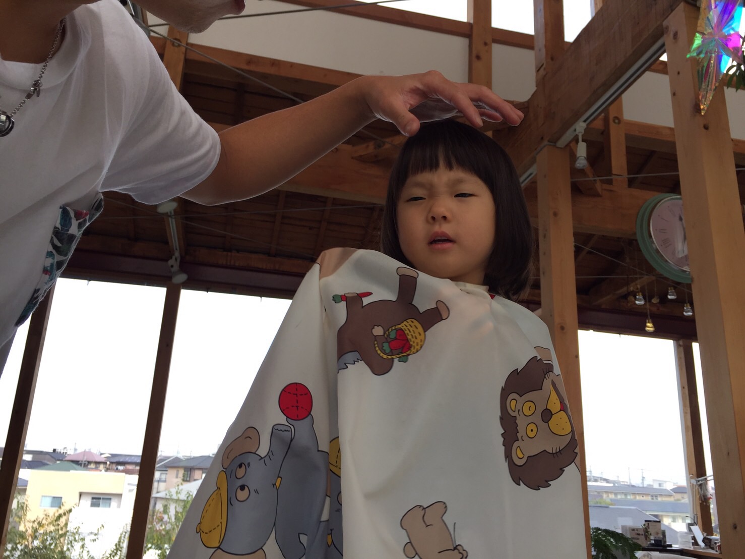 なかなか子供はおとなしく座ってられないので色んな小物で目を引かせて、さっさとカットしていきます!