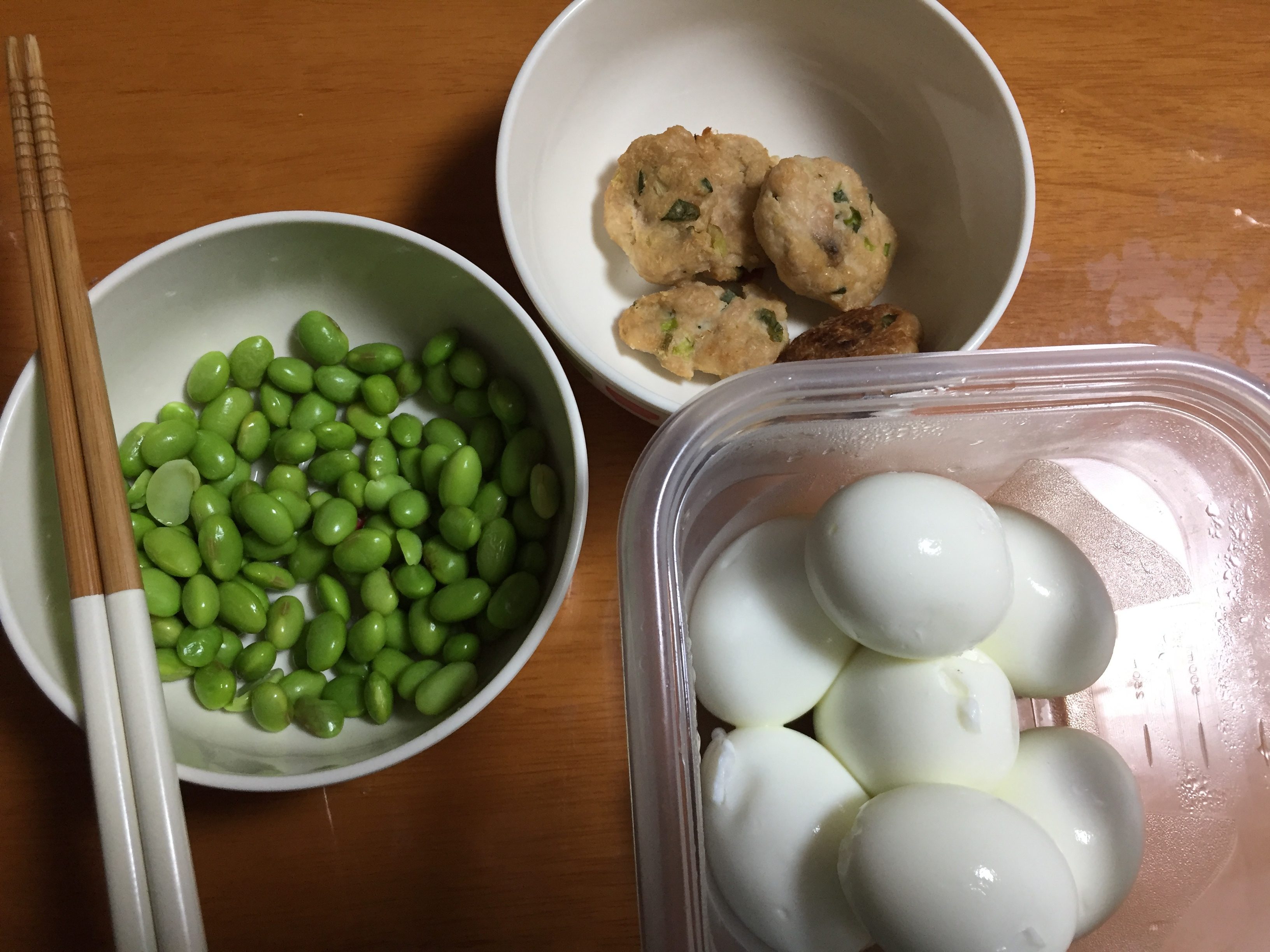 夜 枝豆、鳥の胸肉、ゆで卵。。。